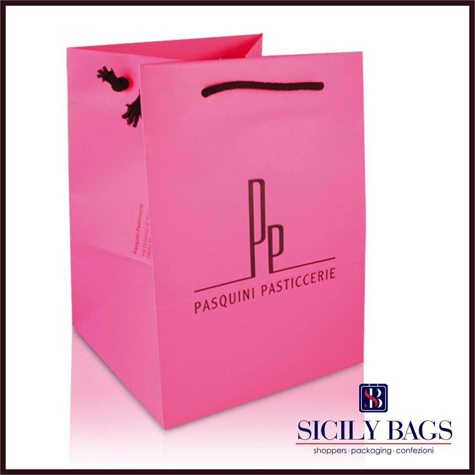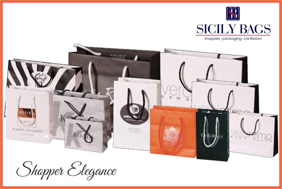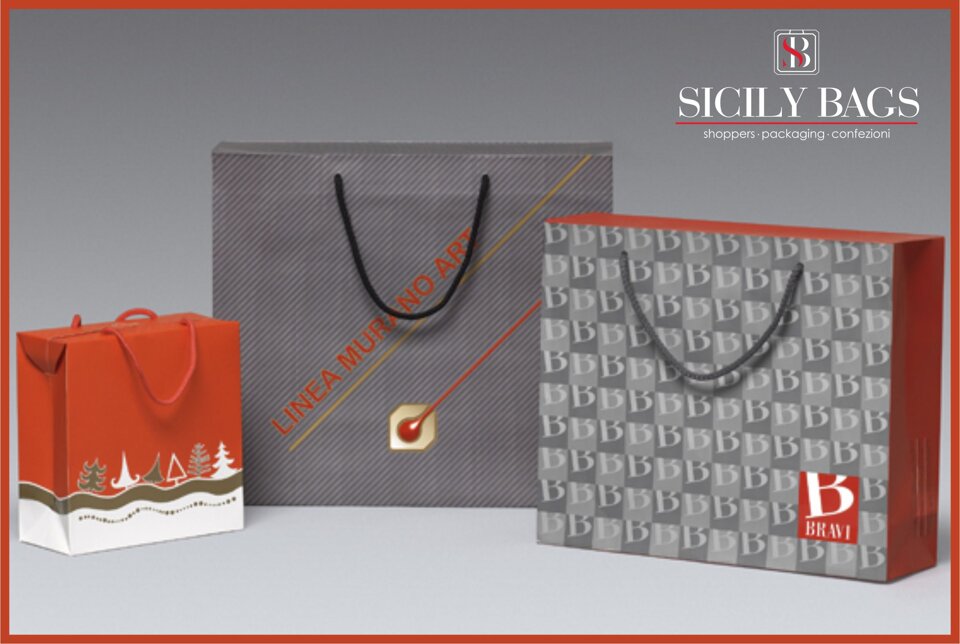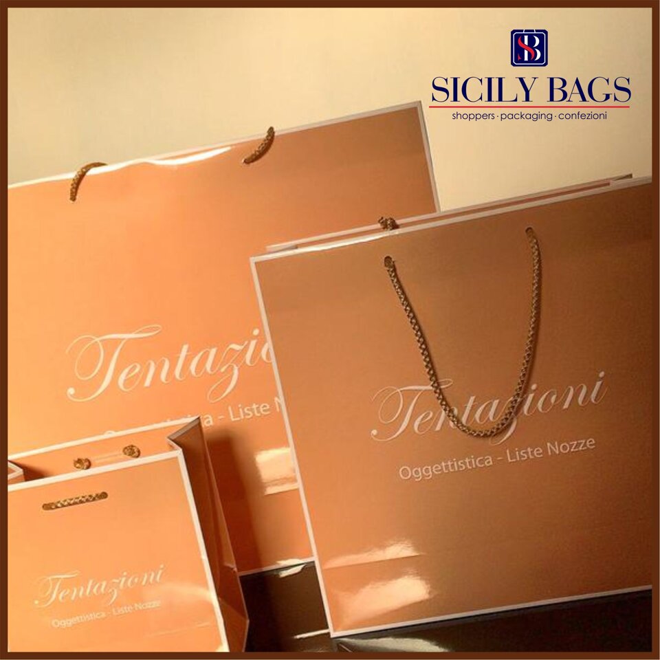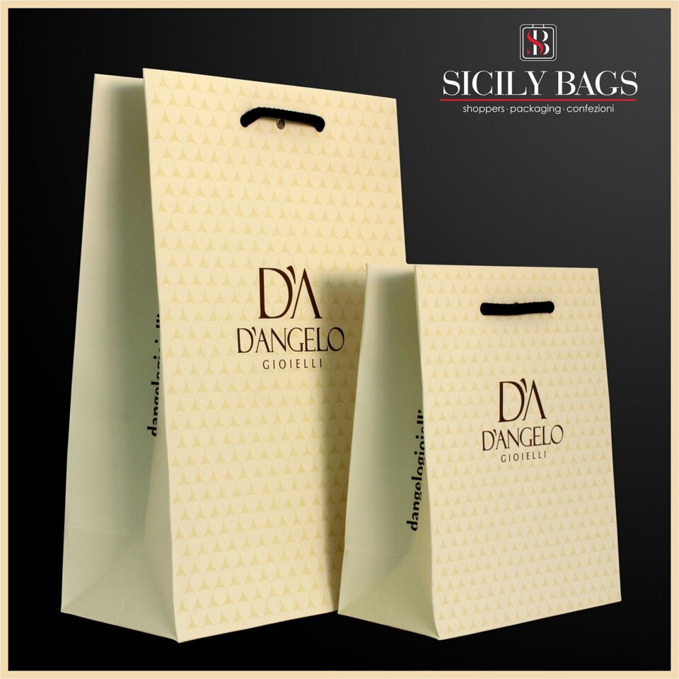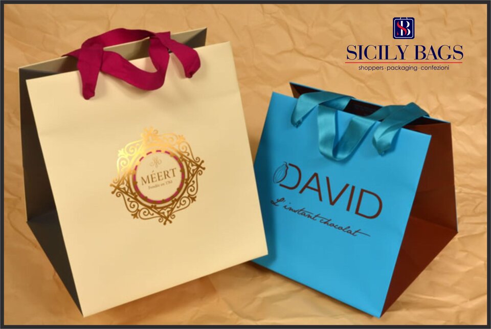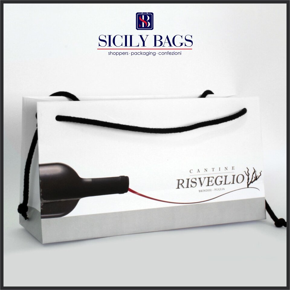 Sono realizzate in carta ad alta grammatura e allestite manualmente. Sono personalizzabili al 100% con stampa offset. Si prestano ad una serie di lavorazioni aggiuntive che ne valorizzano l’immagine, come la stampa uv, la stampa a caldo e a rilievo. L’eventuale plastificazione, lucida o opaca le può rendere particolarmente eleganti e resistenti. La loro robustezza è anche assicurata dal cartone sul fondo. Il bordo superiore è risvoltato e i manici applicati possono essere in corda di cotone o in fettuccia di cotone, gros grain o raso.