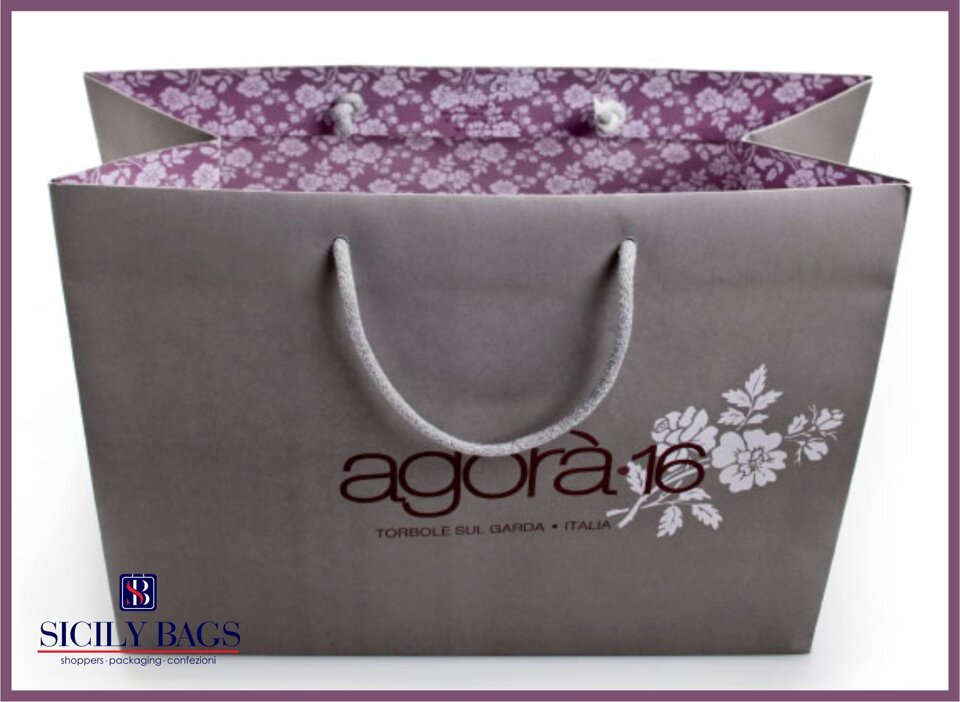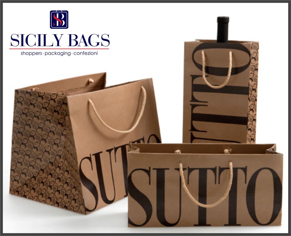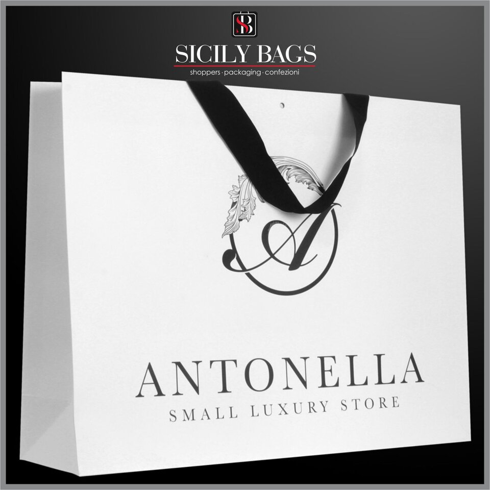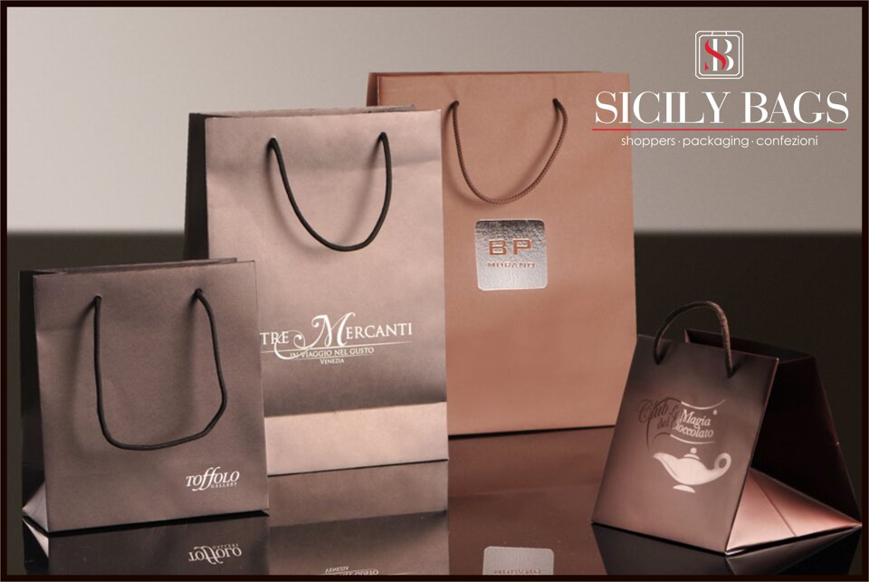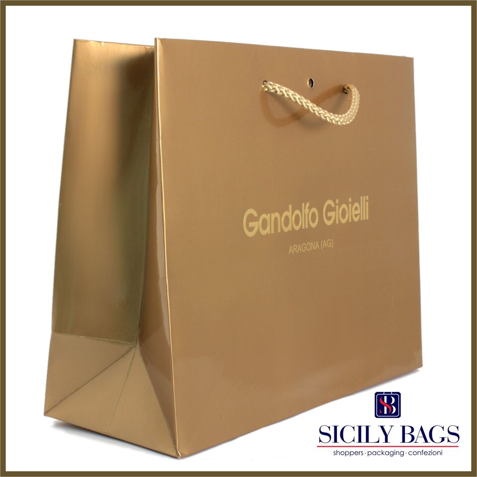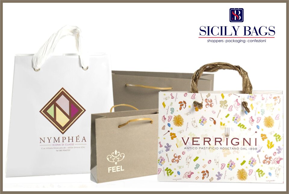 Sono realizzate in carta ad alta grammatura e allestite manualmente. Sono personalizzabili al 100% con stampa offset. Si prestano ad una serie di lavorazioni aggiuntive che ne valorizzano l’immagine, come la stampa uv, la stampa a caldo e a rilievo. L’eventuale plastificazione, lucida o opaca le può rendere particolarmente eleganti e resistenti. La loro robustezza è anche assicurata dal cartone sul fondo. Il bordo superiore è risvoltato e i manici applicati possono essere in corda di cotone o in fettuccia di cotone, gros grain o raso.