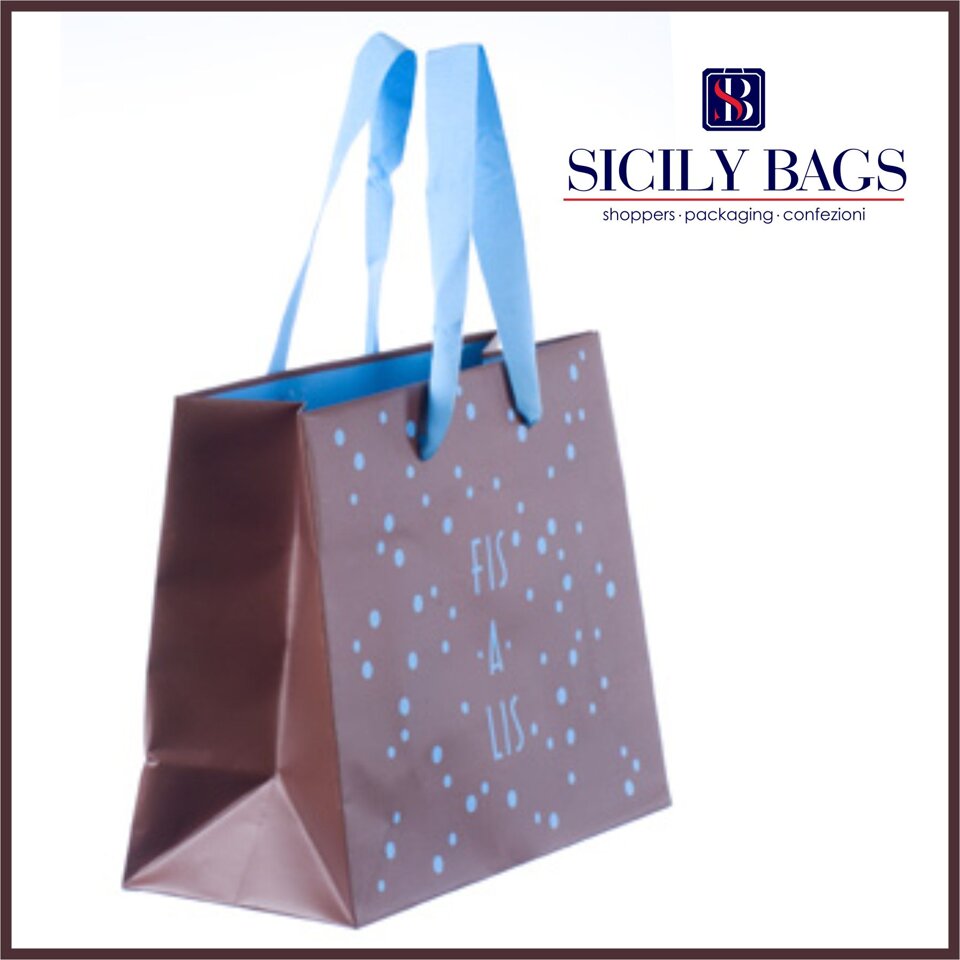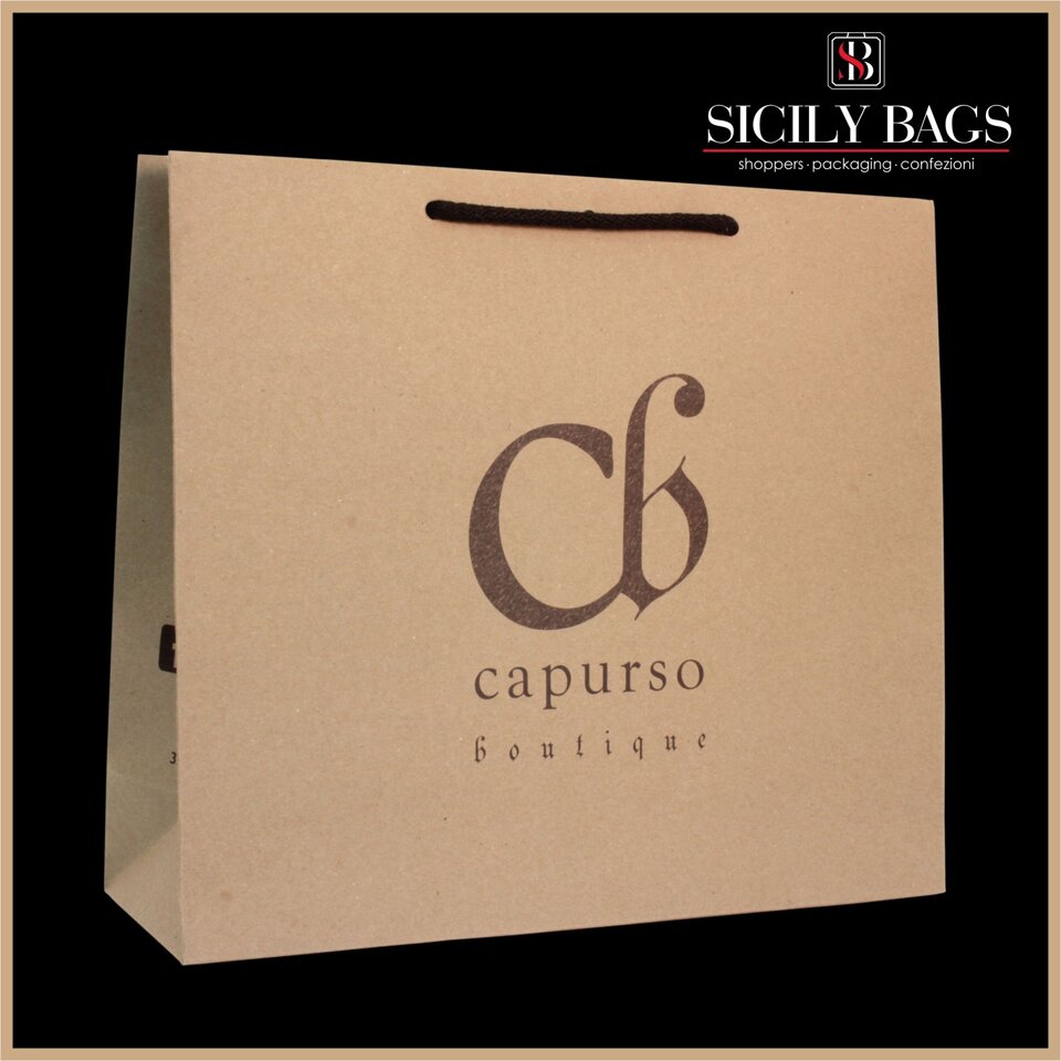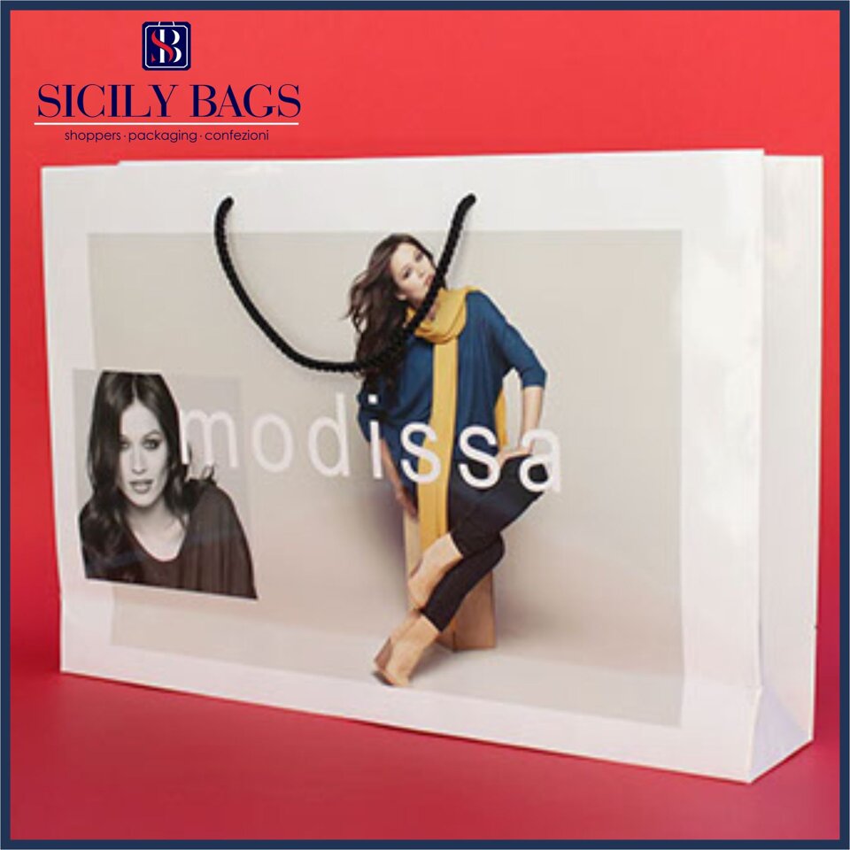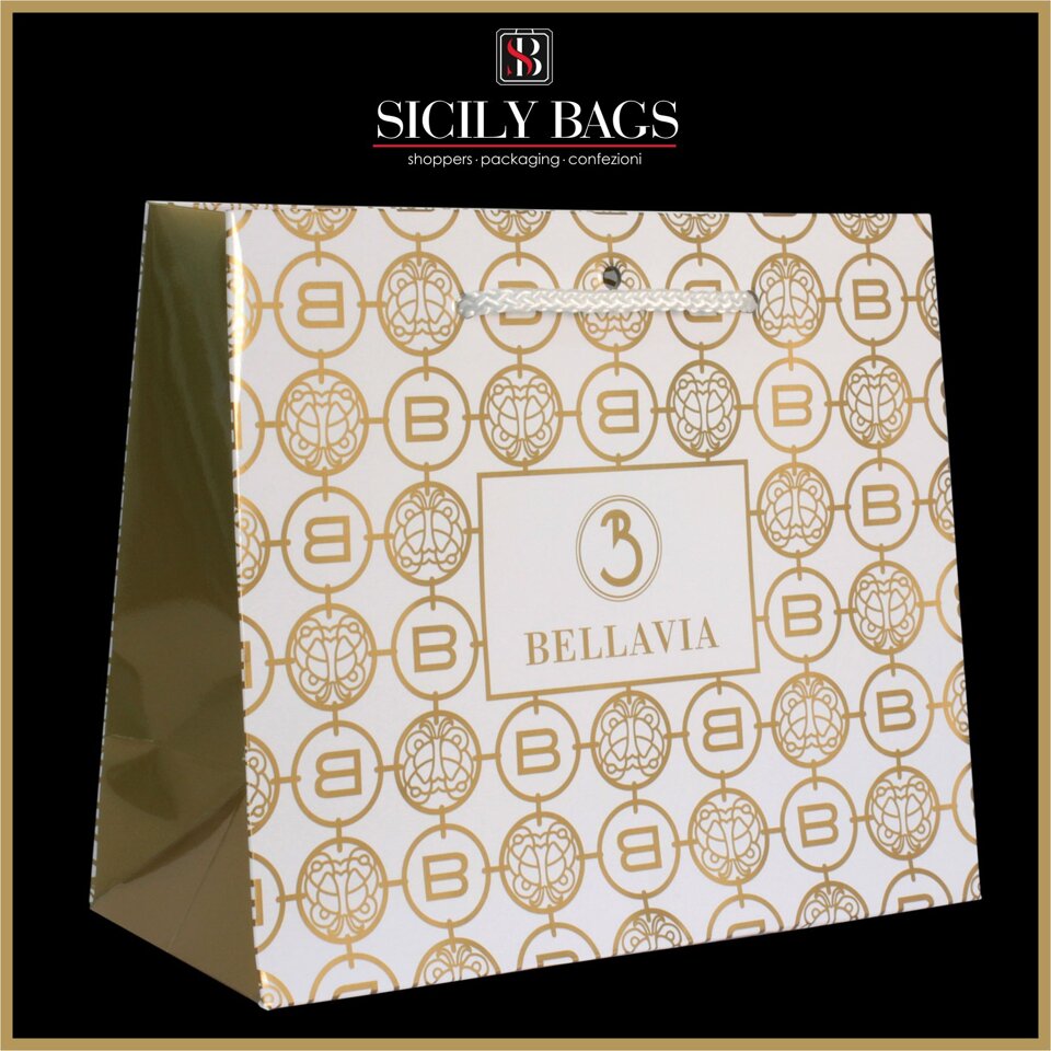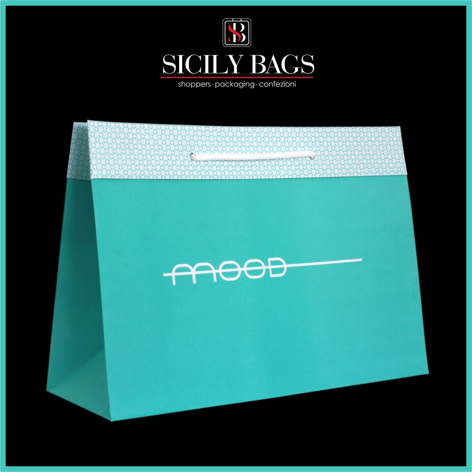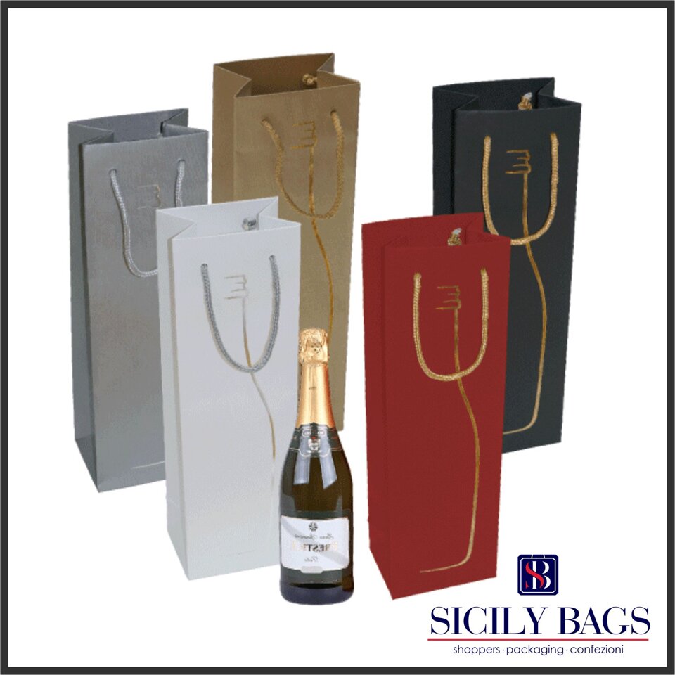 Sono realizzate in carta ad alta grammatura e allestite manualmente. Sono personalizzabili al 100% con stampa offset. Si prestano ad una serie di lavorazioni aggiuntive che ne valorizzano l’immagine, come la stampa uv, la stampa a caldo e a rilievo. L’eventuale plastificazione, lucida o opaca le può rendere particolarmente eleganti e resistenti. La loro robustezza è anche assicurata dal cartone sul fondo. Il bordo superiore è risvoltato e i manici applicati possono essere in corda di cotone o in fettuccia di cotone, gros grain o raso.