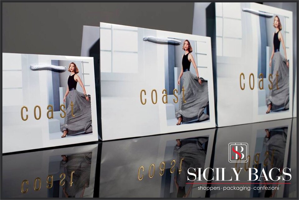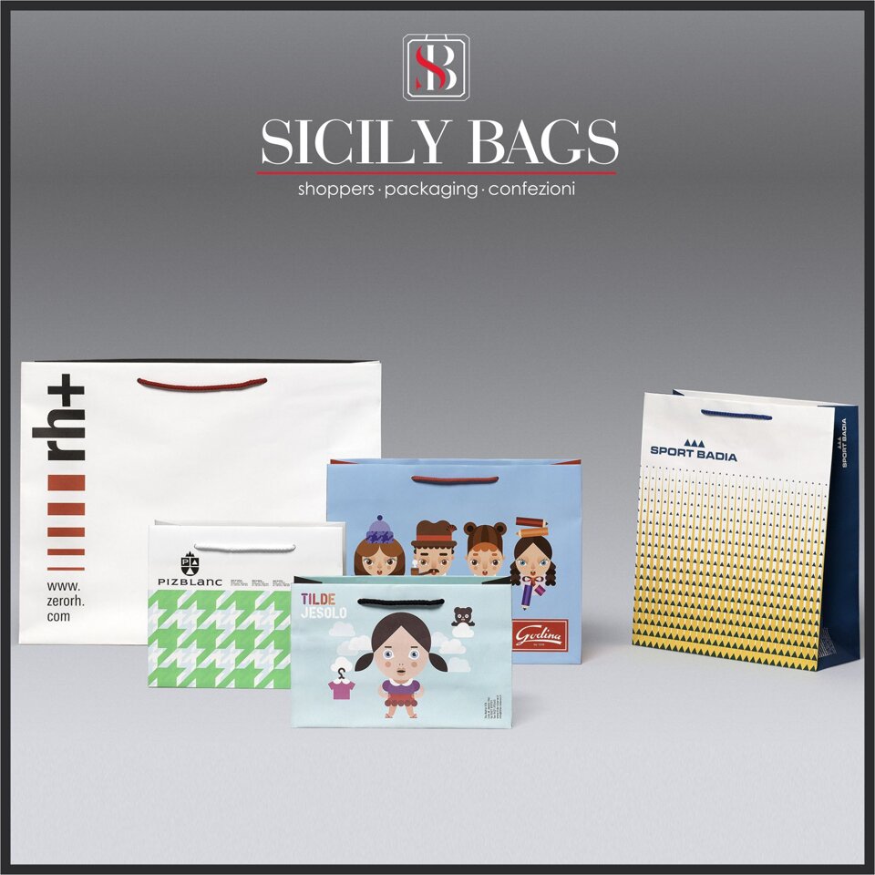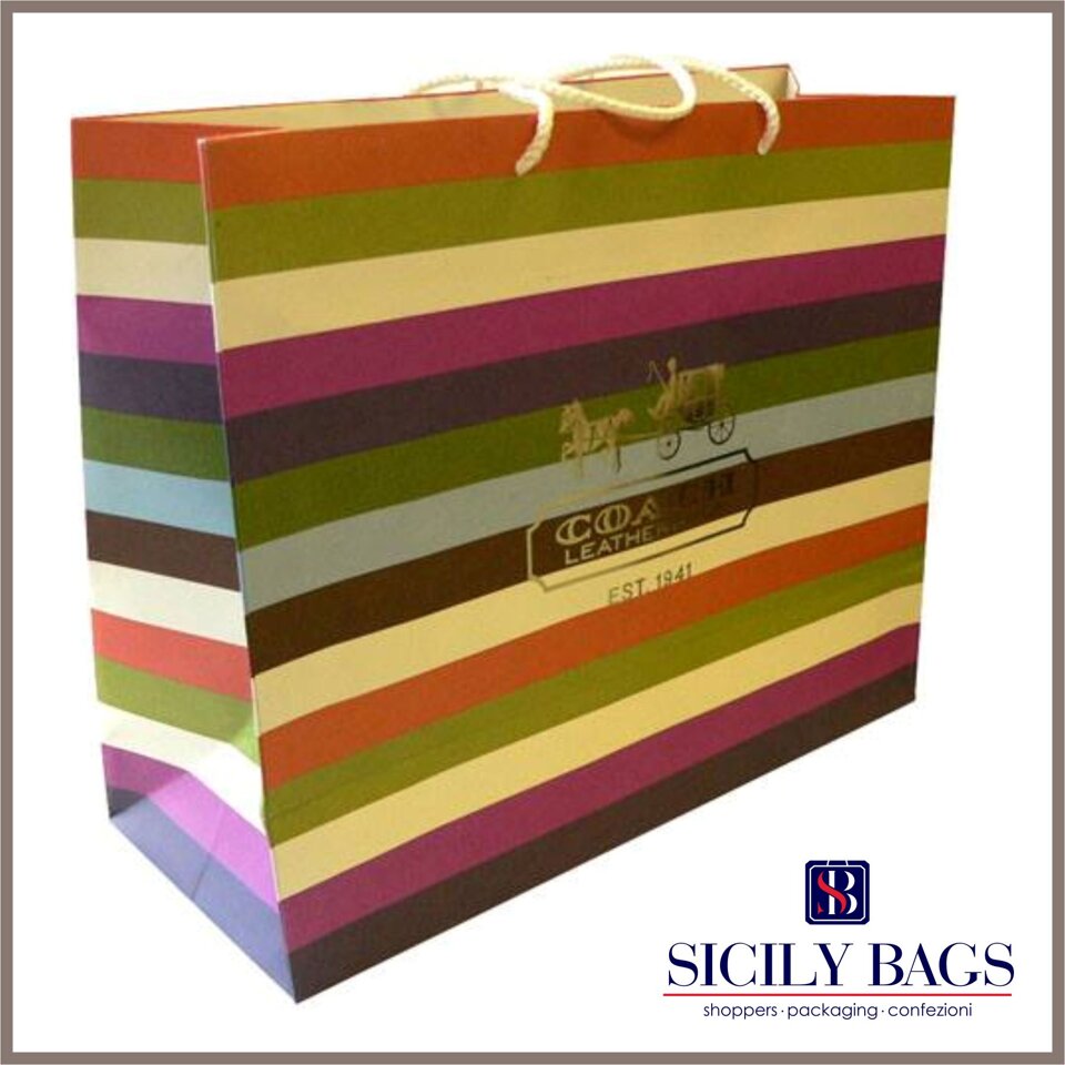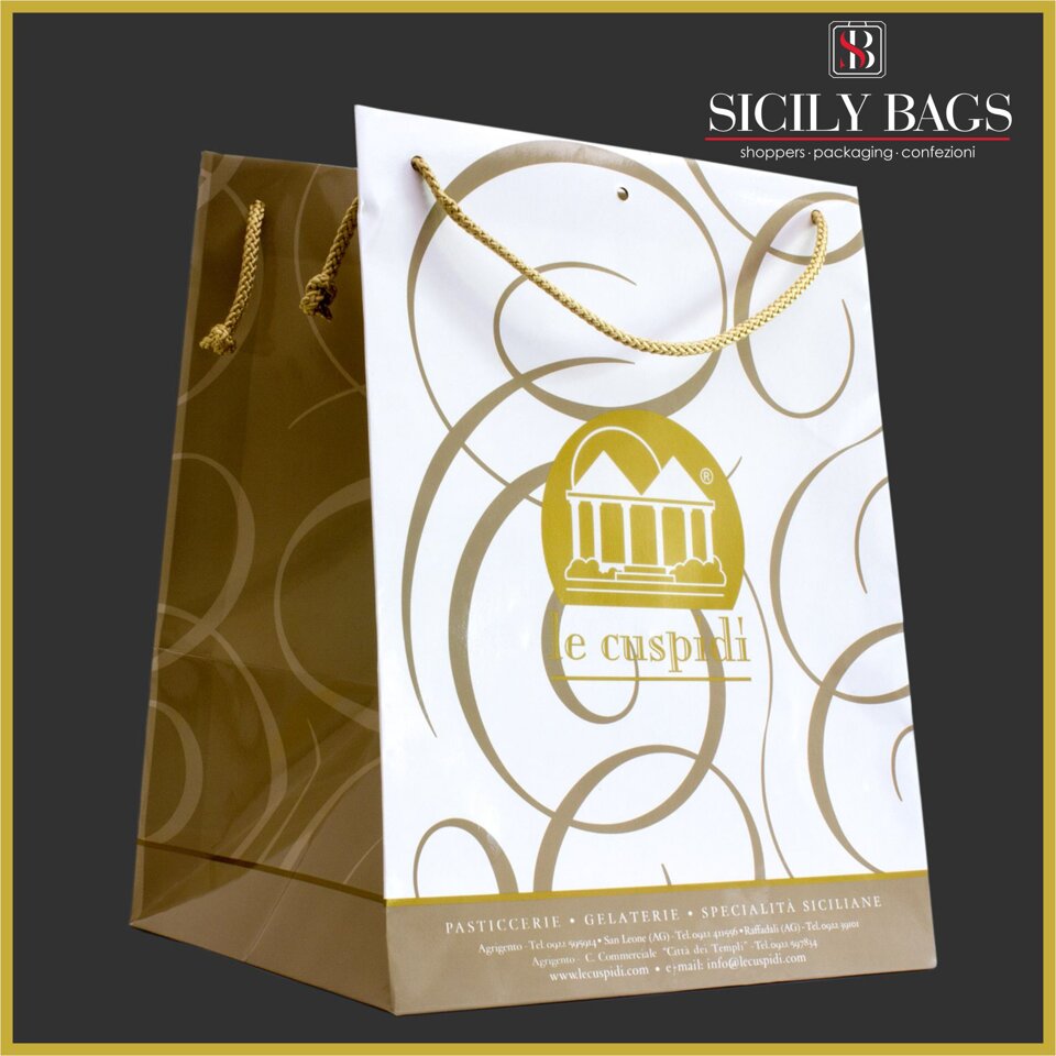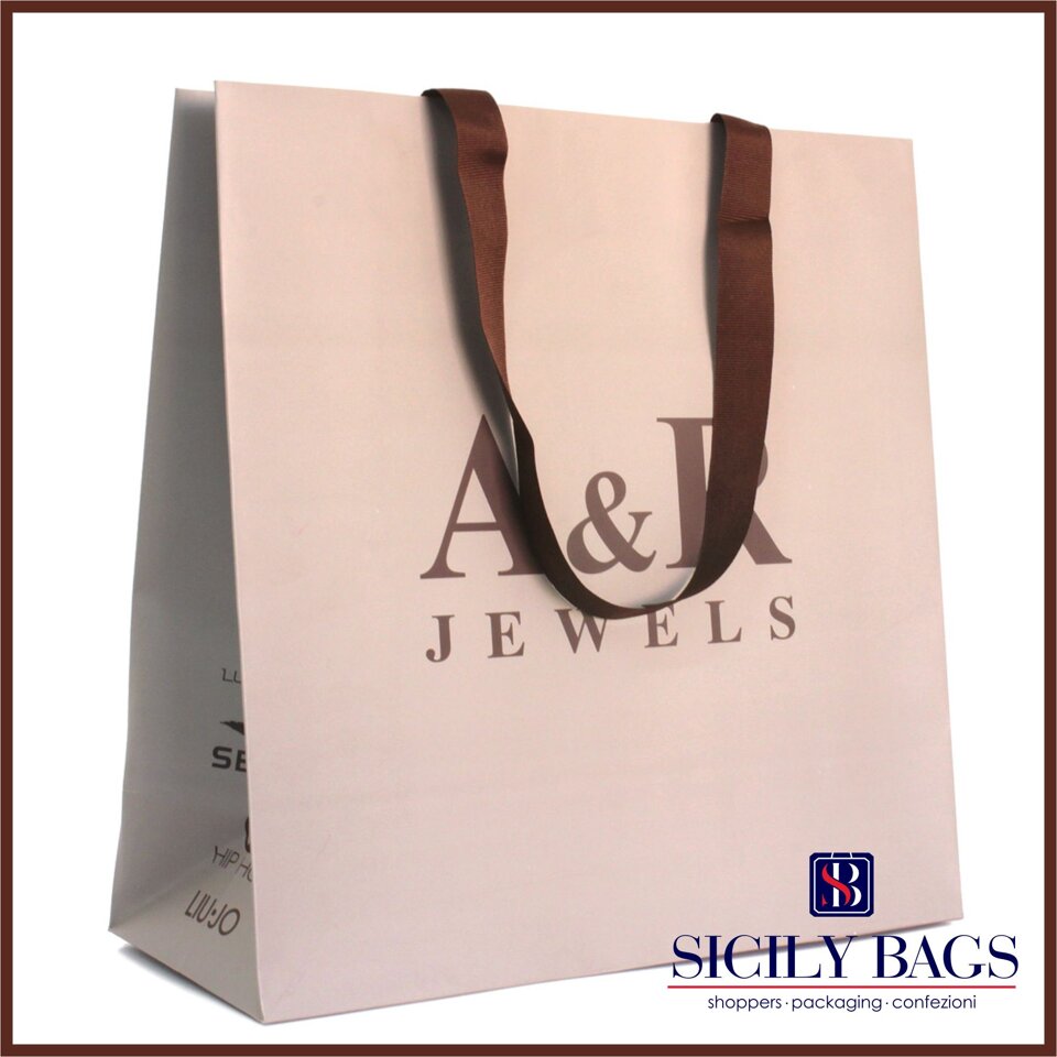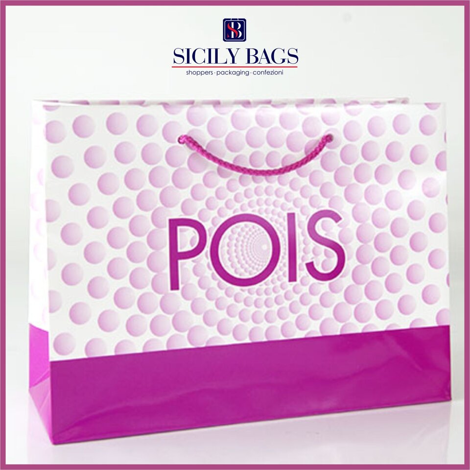 Sono realizzate in carta ad alta grammatura e allestite manualmente. Sono personalizzabili al 100% con stampa offset. Si prestano ad una serie di lavorazioni aggiuntive che ne valorizzano l’immagine, come la stampa uv, la stampa a caldo e a rilievo. L’eventuale plastificazione, lucida o opaca le può rendere particolarmente eleganti e resistenti. La loro robustezza è anche assicurata dal cartone sul fondo. Il bordo superiore è risvoltato e i manici applicati possono essere in corda di cotone o in fettuccia di cotone, gros grain o raso.